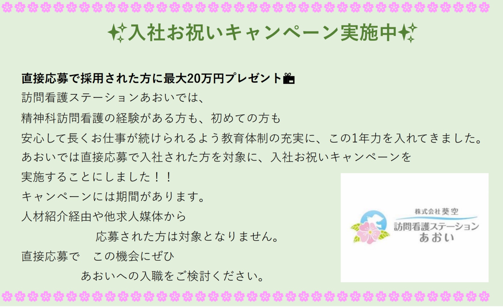 対象; 直接応募で面接後、上記キャンペーン期間中に採用に至った方で、あおいに入社した後1年間勤務し、以降も継続的に就労する意思が明らかな方。
